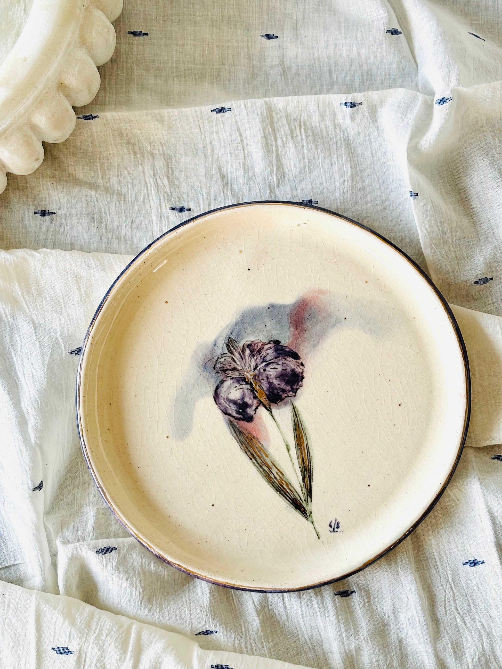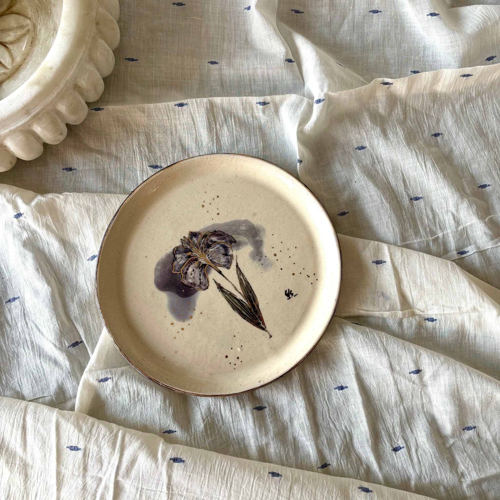 Material: High fired stoneware clay; Handmade in artist studio along with Handpainted Iris flower impressions. The piece has been accentuated in 24 Karat Gold. No two pieces would be the same. Please contact us to know more about the piece in stock.