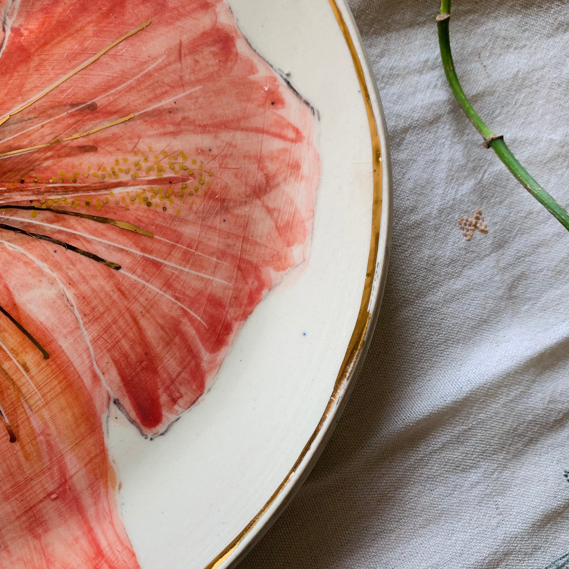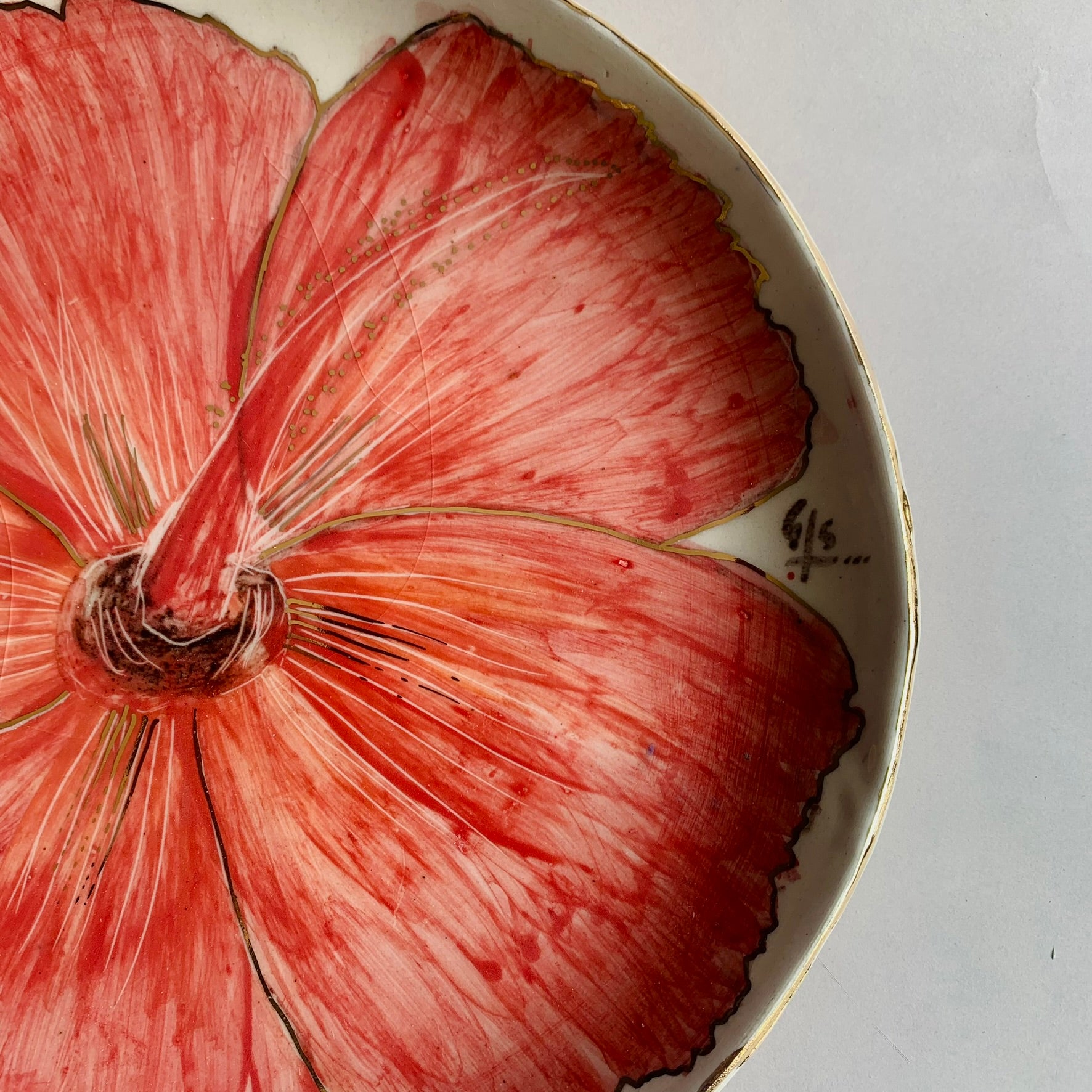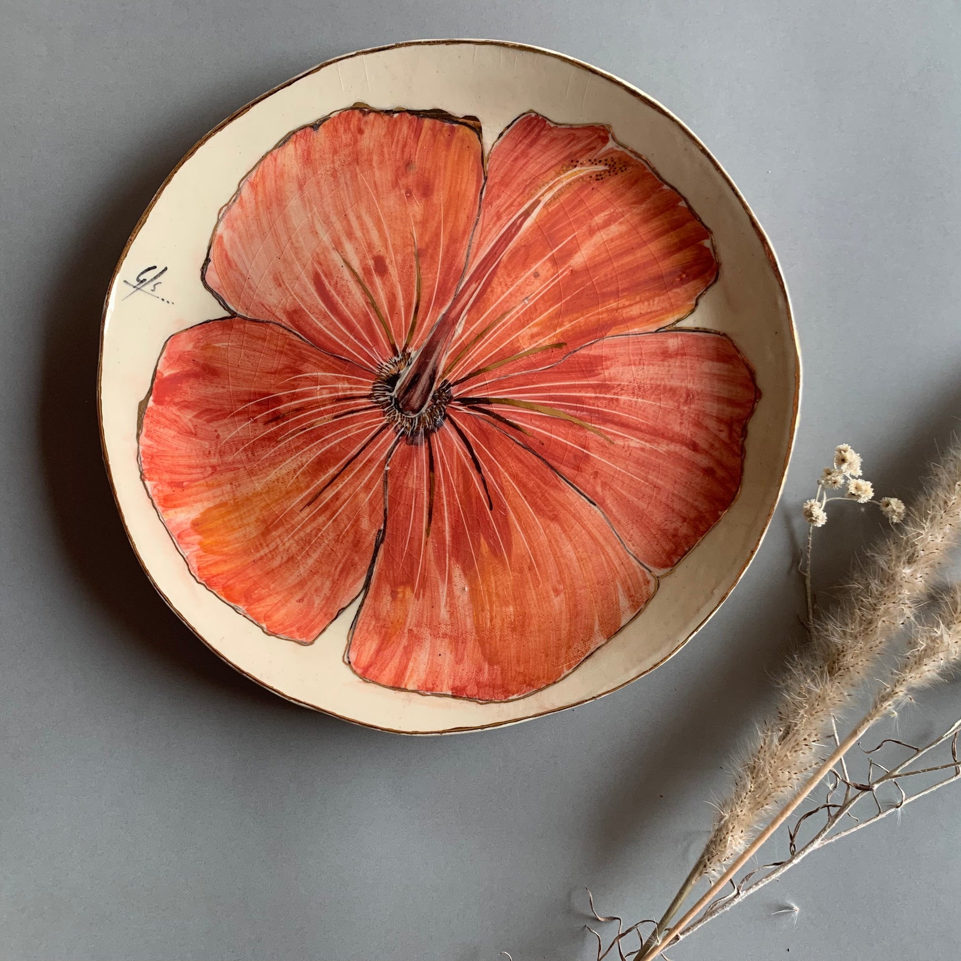 Material: High fired stoneware clay; Handmade in artist studio along with Handpainted Hibiscus impressions. The piece has been finished in 24 Karat Gold