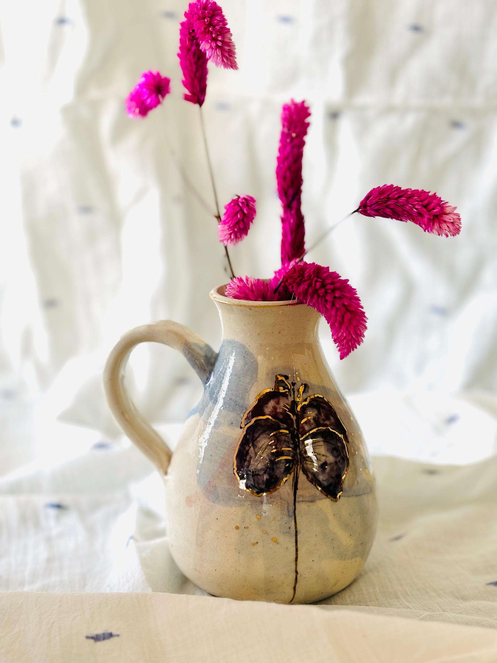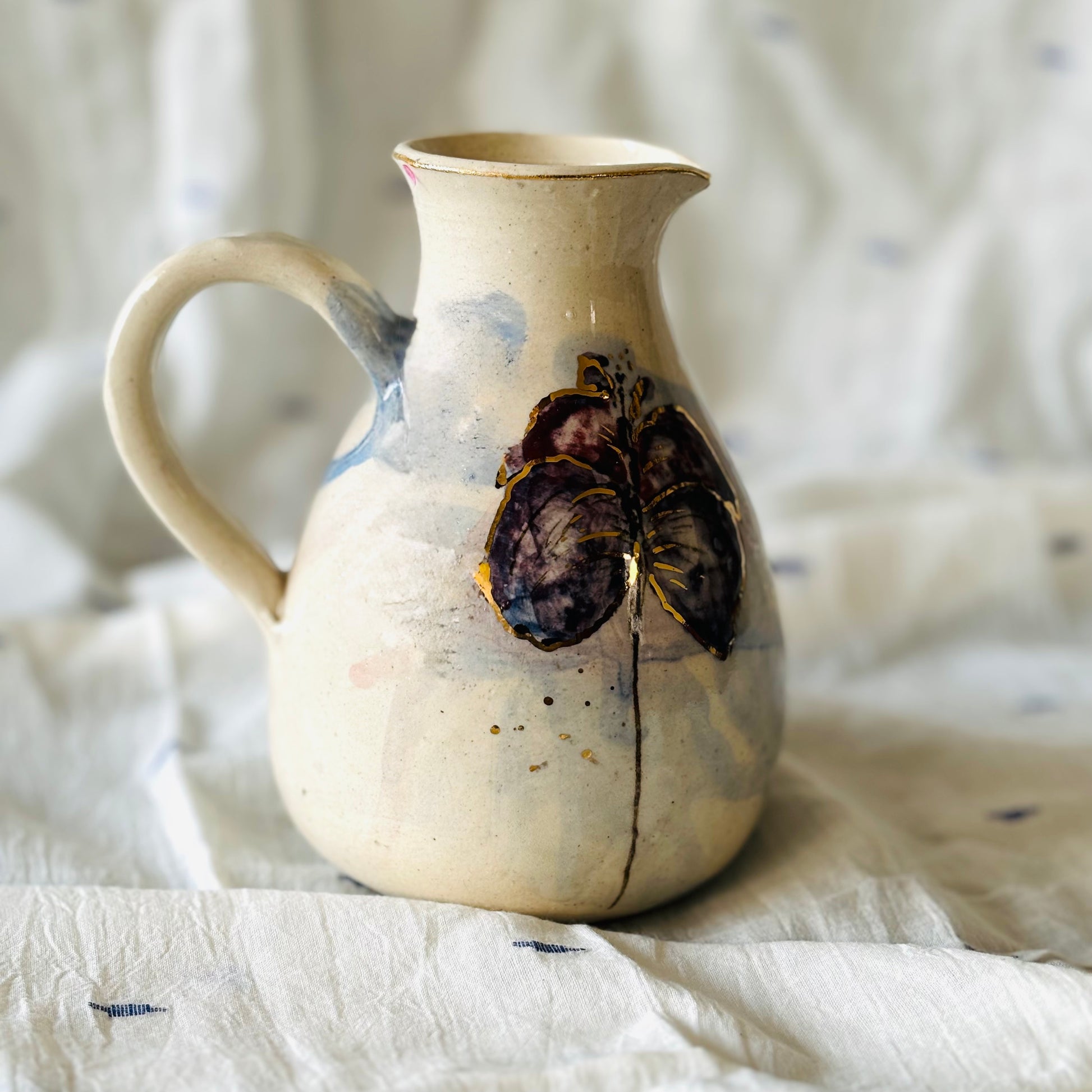 Material: High fired stoneware clay; Handmade in artist studio along with Handpainted Iris flower impressions. The piece has been accentuated in 24 Karat Gold. No two pieces would be the same. Please contact us to know more about the piece in stock.