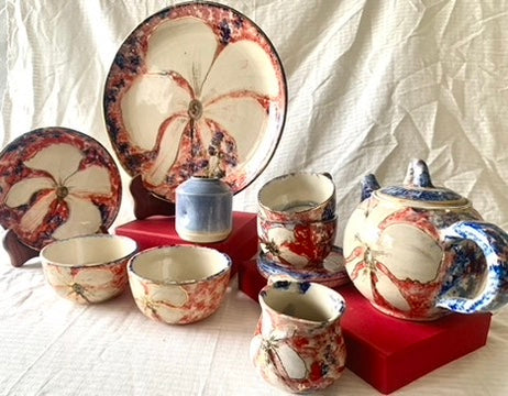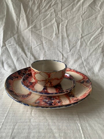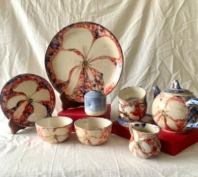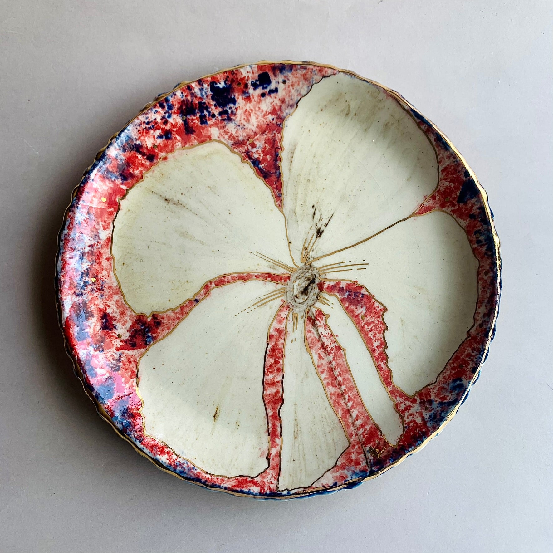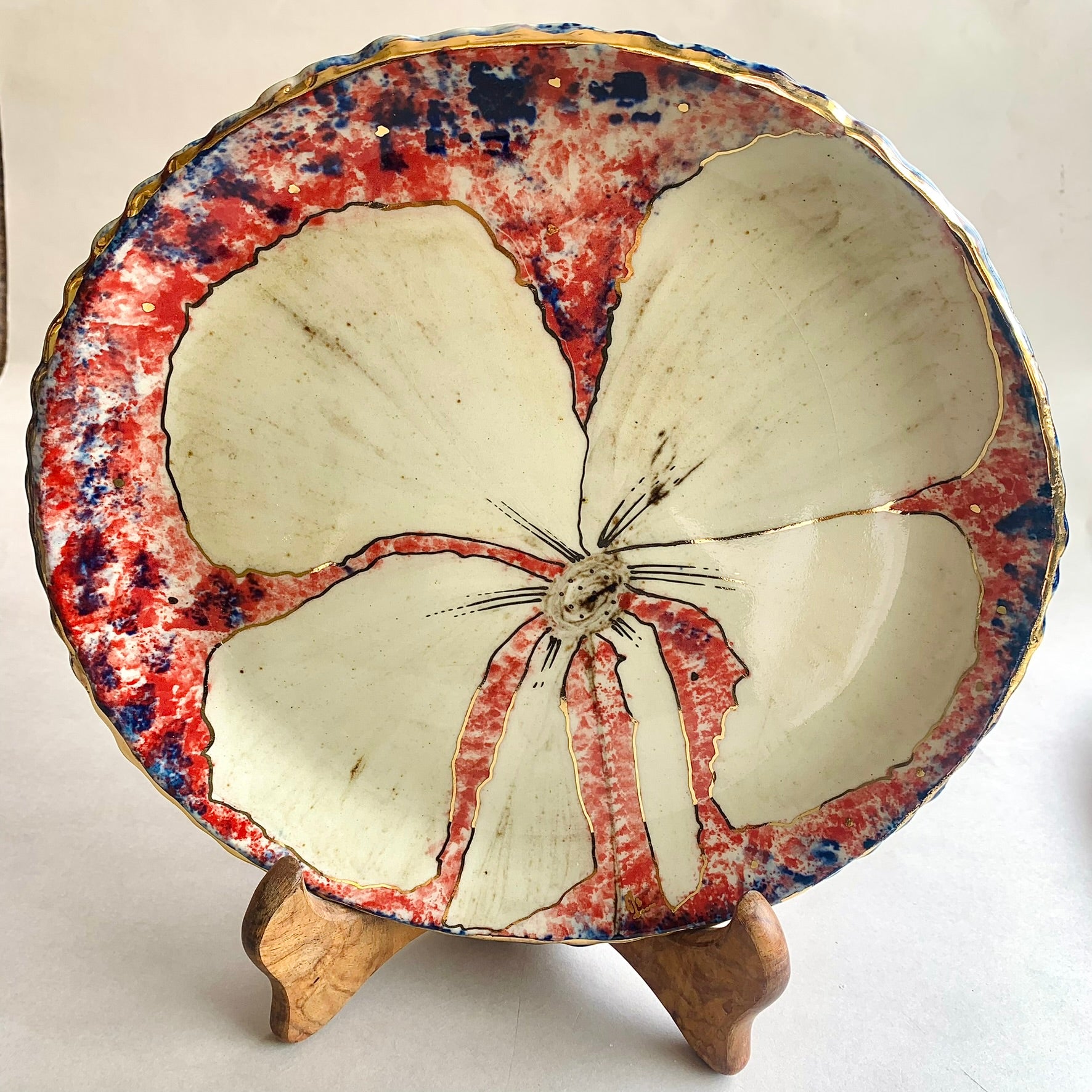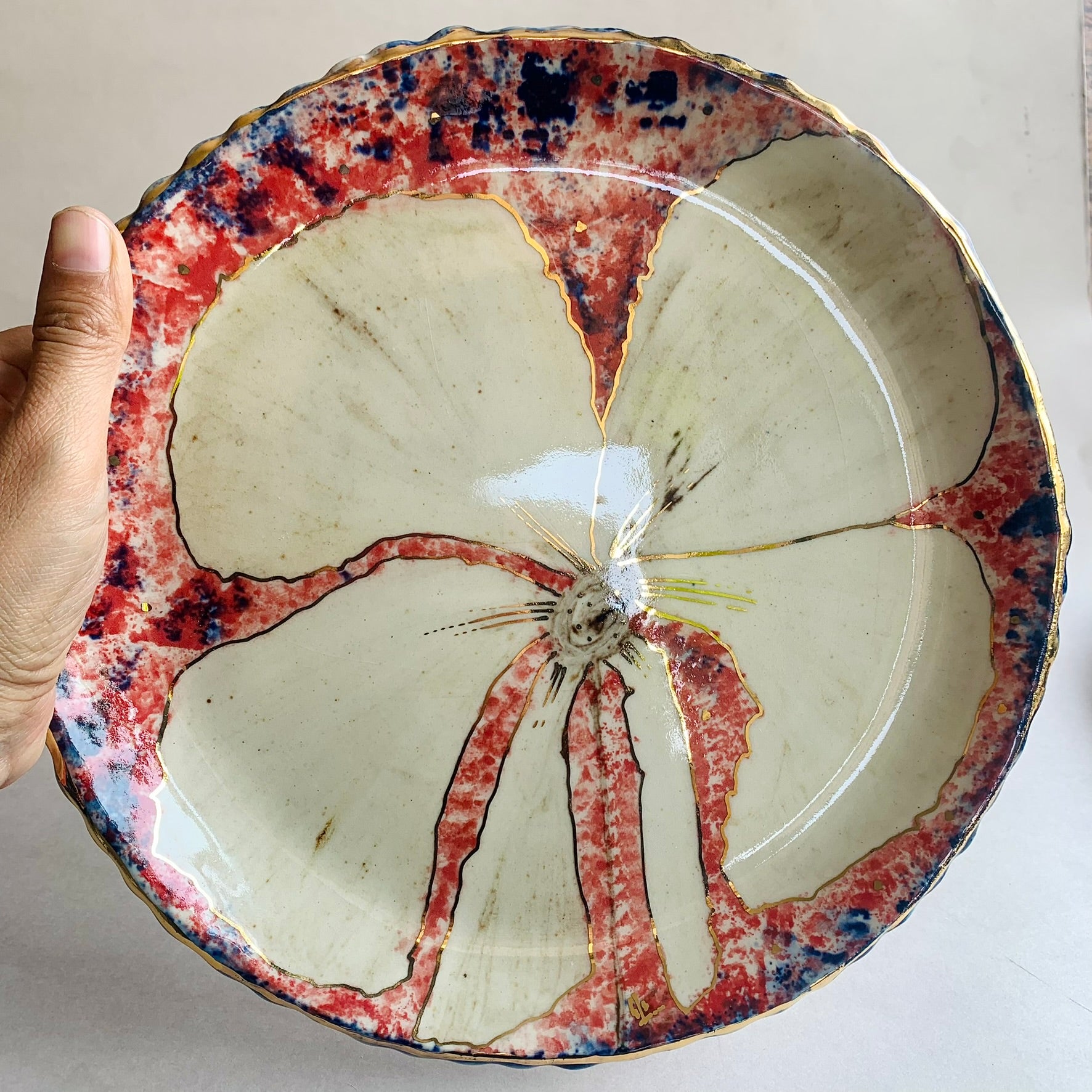 Material: High fired stoneware clay; Handmade in artist studio along with Handpainted Lily impressions. The piece has been finished in 24 Karat Gold