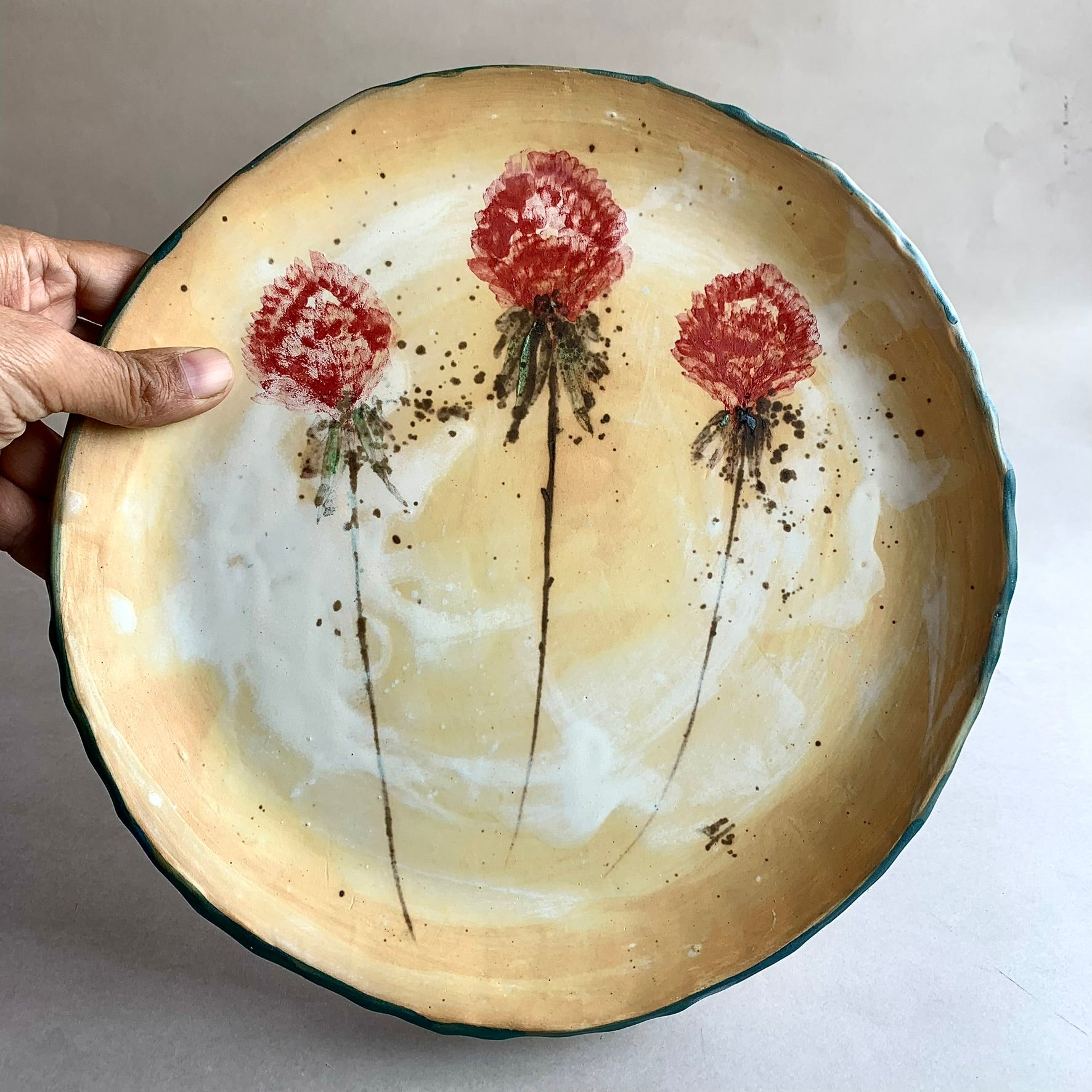 Material: High fired stoneware clay; Handmade in artist studio along with Handpainted Peony floral impressions.